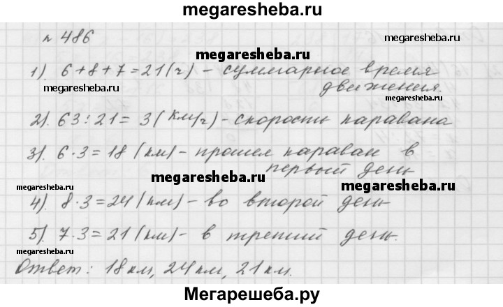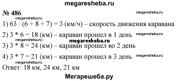 486. Двигаясь по пустыне в течение трёх дней, караван преодолел 63 км. В первый день караван двигался 6 ч, во второй — 8 ч, а в третий — 7 ч. Сколько километров проходил караван каждый день, если известно, что он двигался все дни с постоянной скоростью?