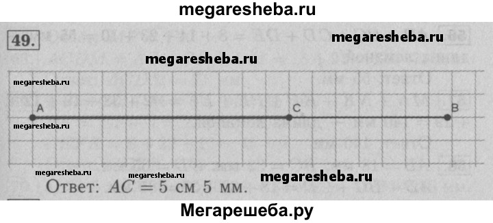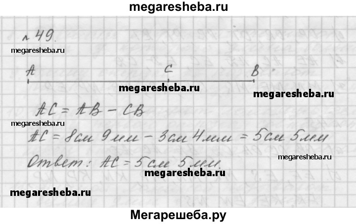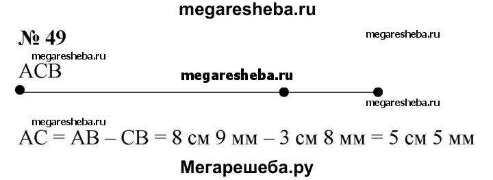49. Начертите отрезок АВ, длина которого равна 8 см 9 мм. Отметьте на нём точку С так, чтобы СВ = 3 см 4 мм. Какова длина отрезка АС?