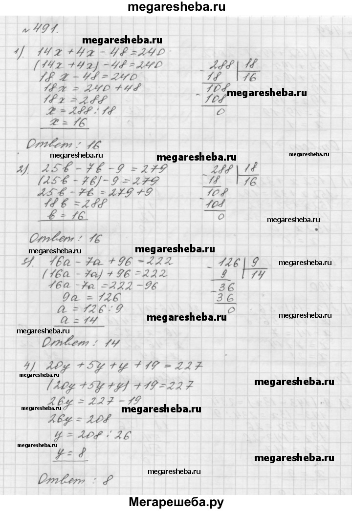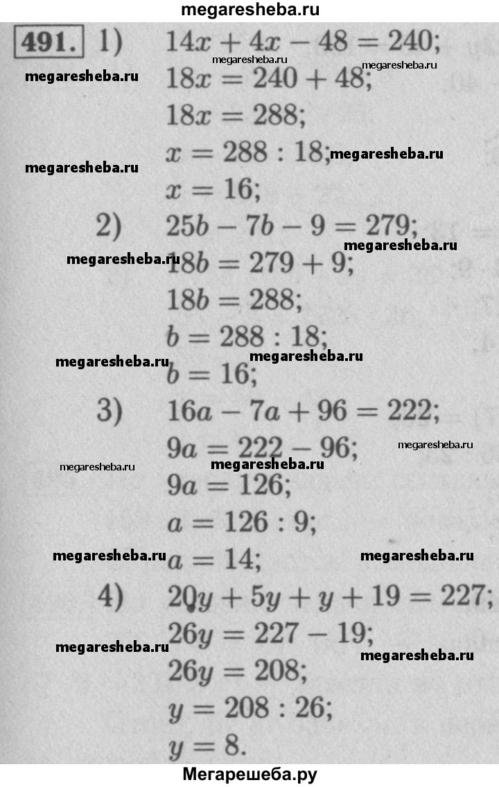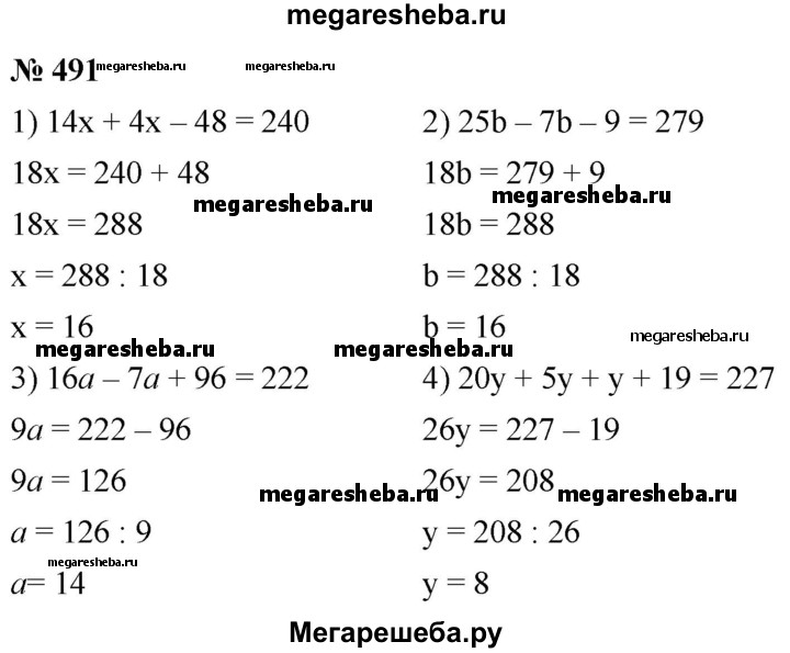 491. Решите уравнение: 1) 14x + 4x - 48 = 240; 2) 25b -7b-9 = 279; 3) 16a - 7а + 96 = 222; 4) 20у + 5у + у + 19 = 227.