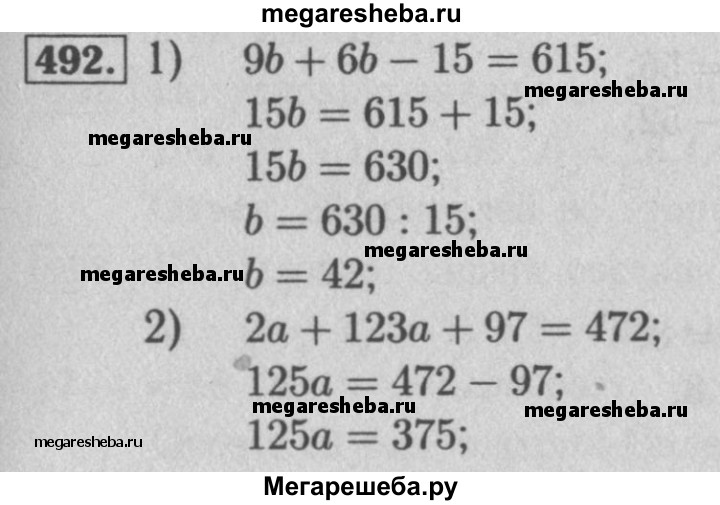 492. Решите уравнение: 1) 9b + 6b- 15 = 615; 2) 2а + 123a + 97 = 472; 3) 17x-x+ 5x- 19 = 170; 4) 73у -у- 22у + 40 = 190.