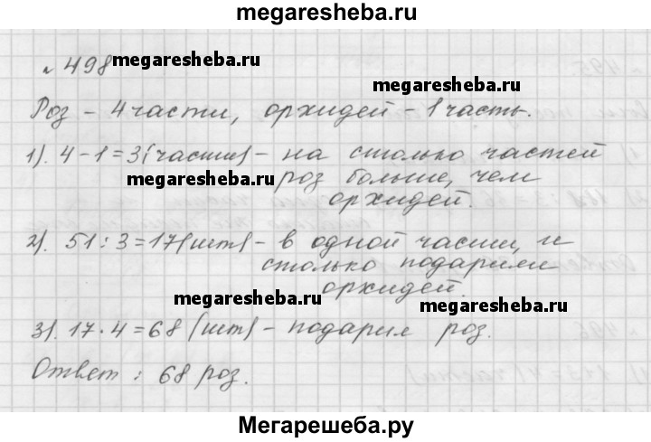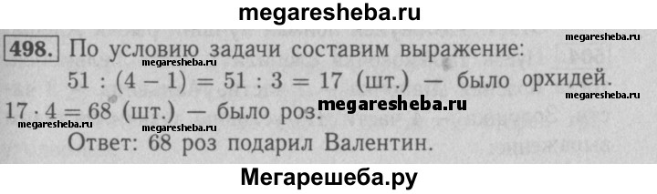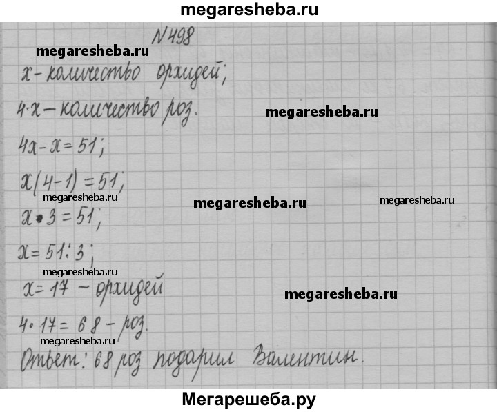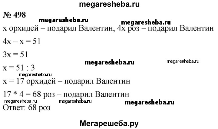 498. Валентин подарил Виктории розы и орхидеи, причём орхидей было в 4 раза меньше, чем роз. Сколько роз подарил Валентин, если известно, что их было на 51 больше, чем орхидей?