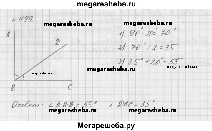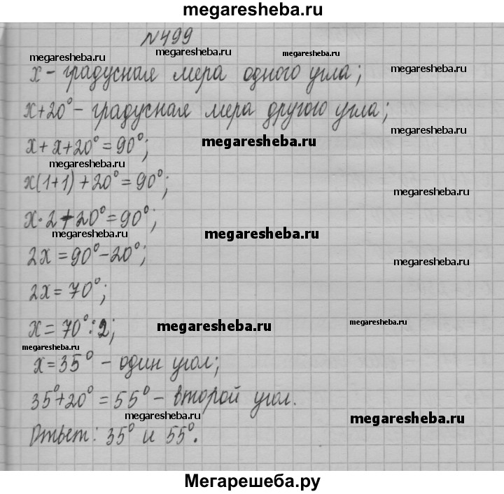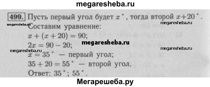 499. Из вершины прямого угла проведён луч так, что он делит прямой угол на два угла, один из которых больше второго на 20°. Найдите величину каждого из образовавшихся углов.