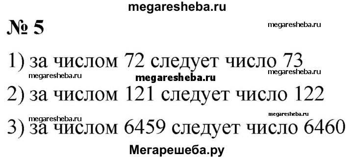 5. Запишите число, которое в натуральном ряду следует за числом: 1) 72; 2) 121; 3) 6 459.