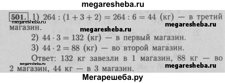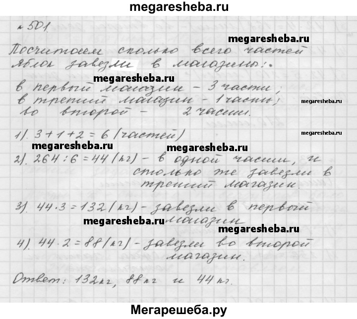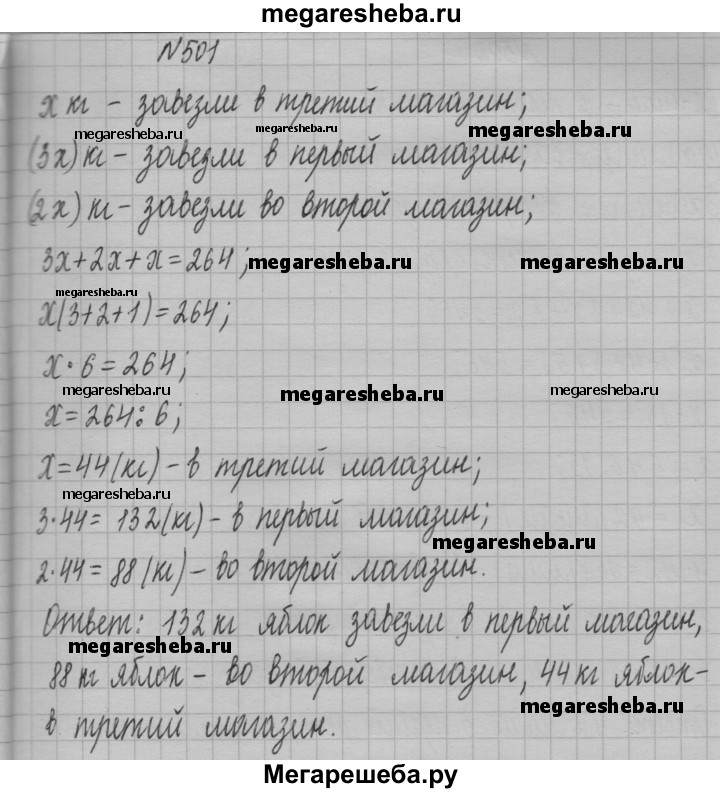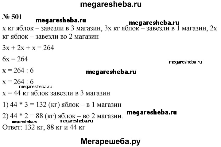 501. В три магазина завезли 264 кг яблок. В первый магазин завезли в 3 раза больше яблок, чем в третий, а во второй — в 2 раза больше, чем в третий. Сколько килограммов яблок завезли в каждый магазин?