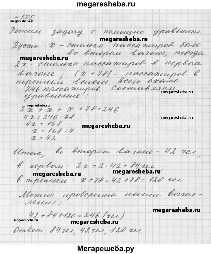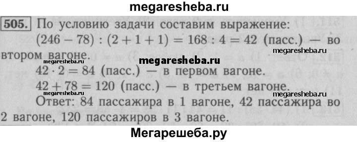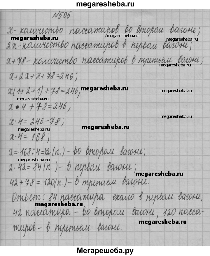 505. В трёх вагонах электропоезда ехало 246 пассажиров. В первом вагоне было в 2 раза больше пассажиров, чем во втором, а в третьем — на 78 пассажиров больше, чем во втором. Сколько пассажиров ехало в каждом вагоне?