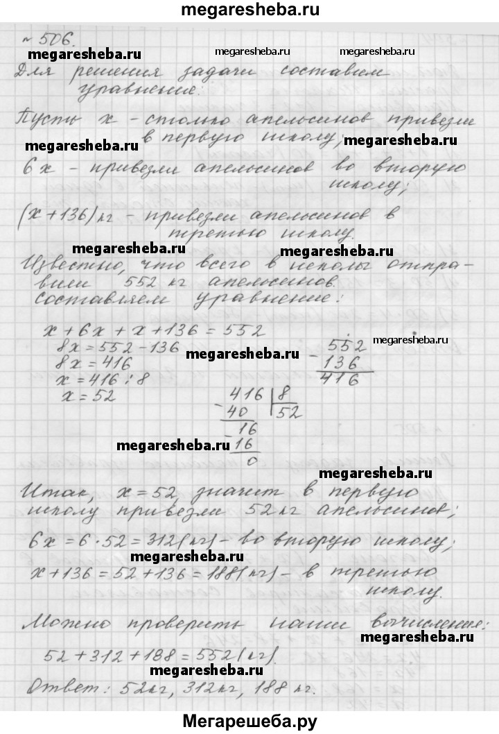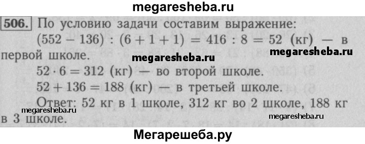 506. В три школы отправили 552 кг апельсинов, причём в одну школу отправили в 6 раз меньше апельсинов, чем во вторую, и на 136 кг меньше, чем в третью. Сколько килограммов апельсинов отправили в каждую школу?