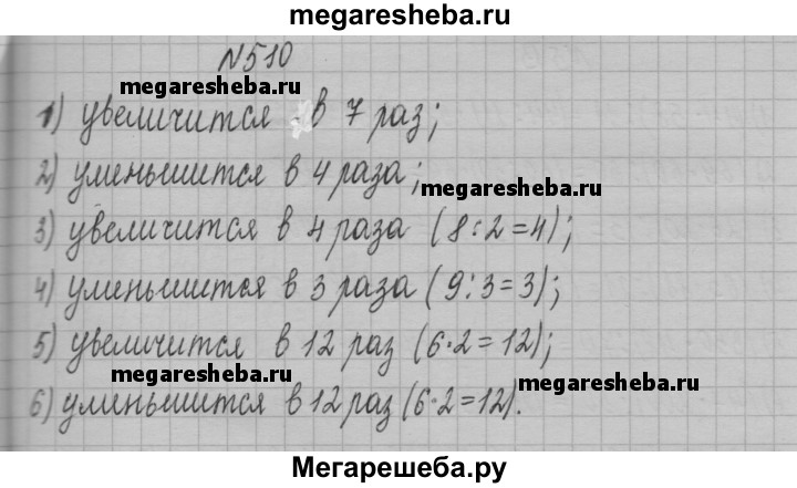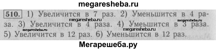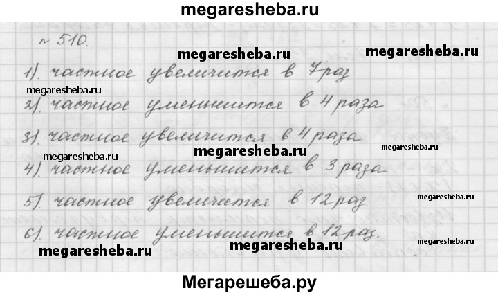 510. Как изменится частное, если: 1) делимое увеличить в 7 раз; 2) делитель увеличить в 4 раза; 3) делимое увеличить в 8 раз, а делитель — в 2 раза; 4) делимое уменьшить в 9 раз, а делитель — в 3 раза; 5) делимое увеличить в 6 раз, а делитель уменьшить в 2 раза; 6) делимое уменьшить в 6 раз, а делитель увеличить в 2 раза?