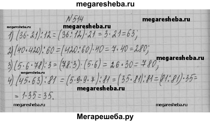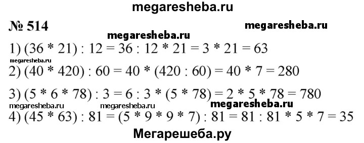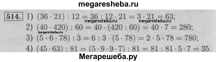 514. Вычислите удобным способом: 1) (36 • 21) : 12; 2) (40 • 420) : 60; 3) (5 • 6 • 78): 3; 4) (45 • 63) : 81.