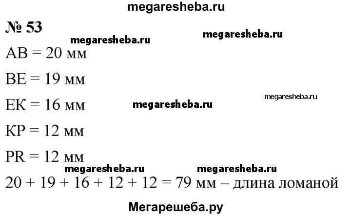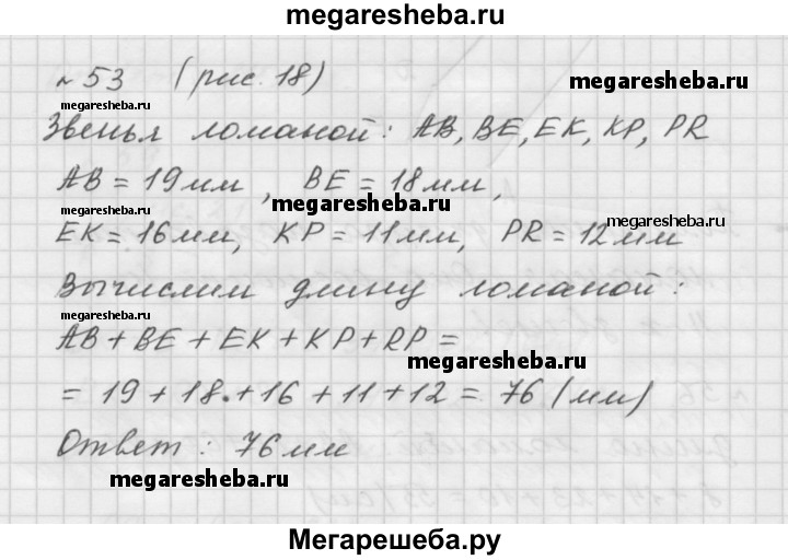 53. Назовите звенья ломаной, изображённой на рисунке 18, и измерьте их длины (в миллиметрах). Вычислите длину ломаной.