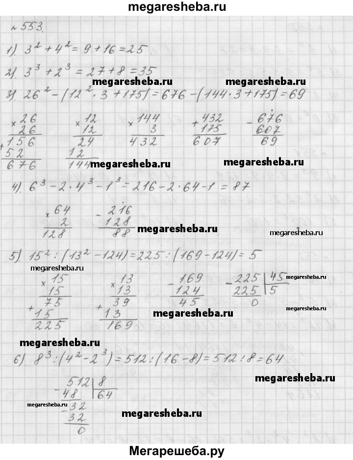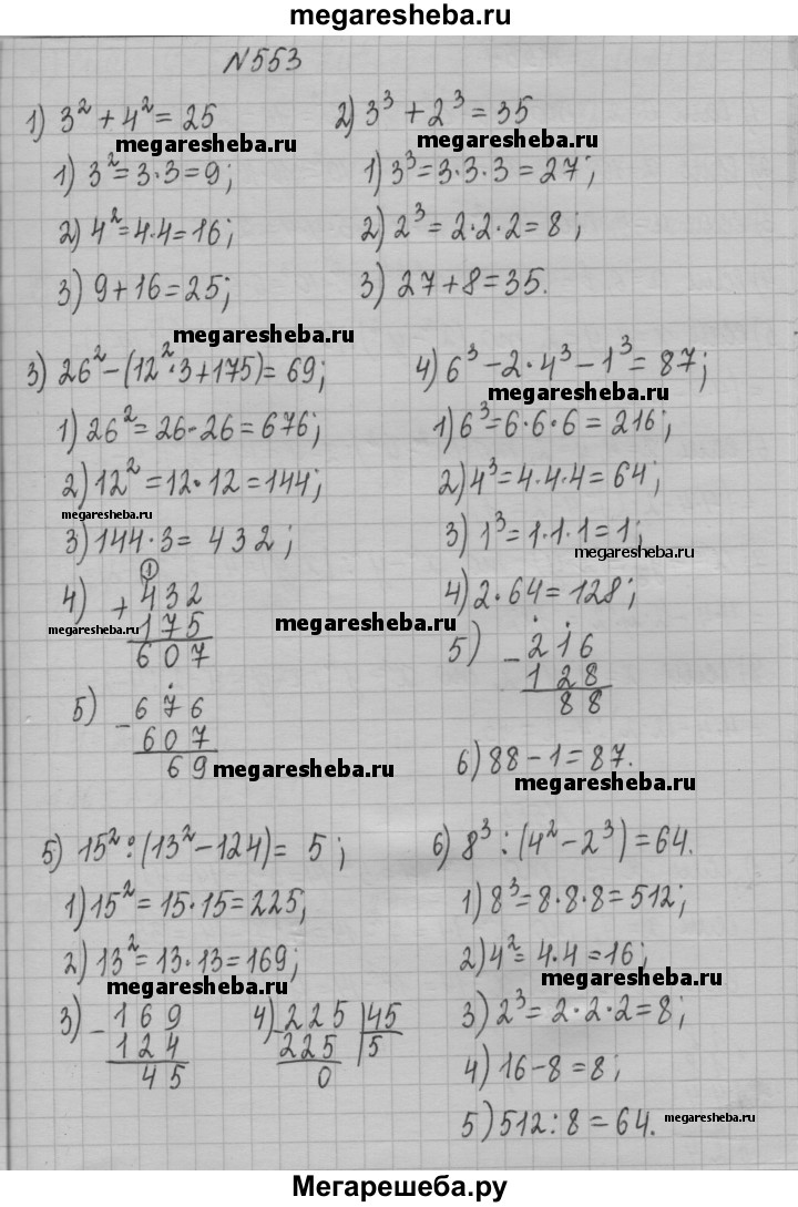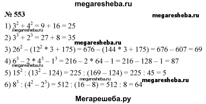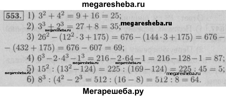 553. Вычислите: 1) З^2 + 4^2; 2) З^3 + 2^3; 3) 26^ - (12^2 • 3 + 175); 4) 6^3 - 2 • 4^3 – 1^3; 5) 15^2 : (13^2 - 124); 6) 8^3 : (4^2 – 2^3).
