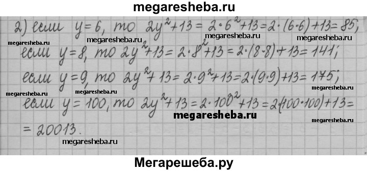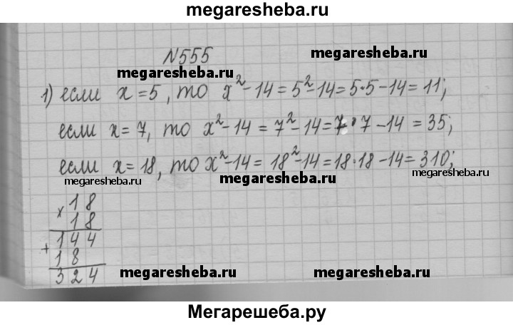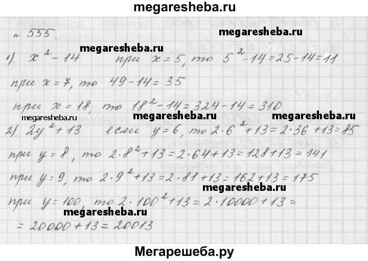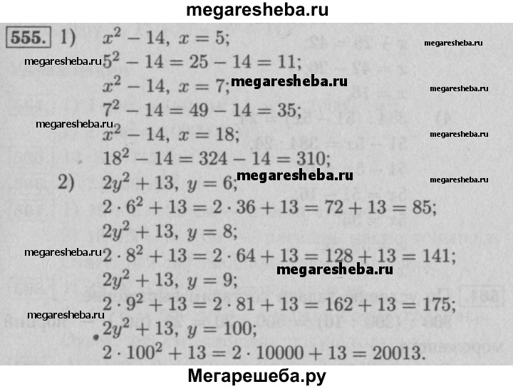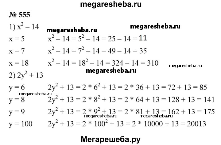 555. Найдите значение выражения: 1) x^2 - 14, если x =5; 7; 18; 2) 2у^2 + 13, если у = 6; 8; 9; 100.