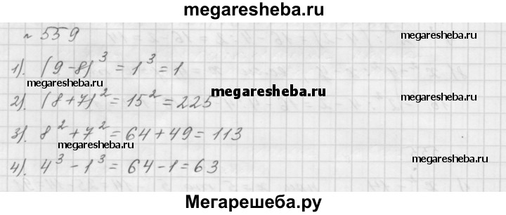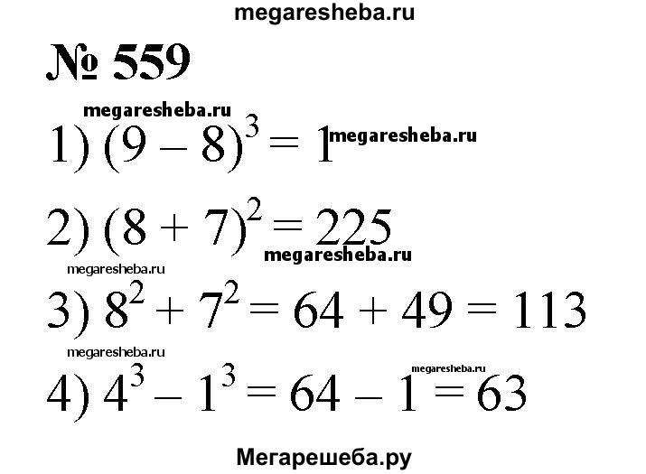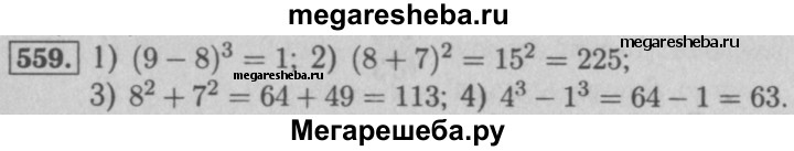 559. Составьте числовое выражение и найдите его значение: 1) куб разности чисел 9 и 8; 2) квадрат суммы чисел 8 и 7; 3) сумма квадратов чисел 8 и 7; 4) разность кубов чисел 4 и 1.