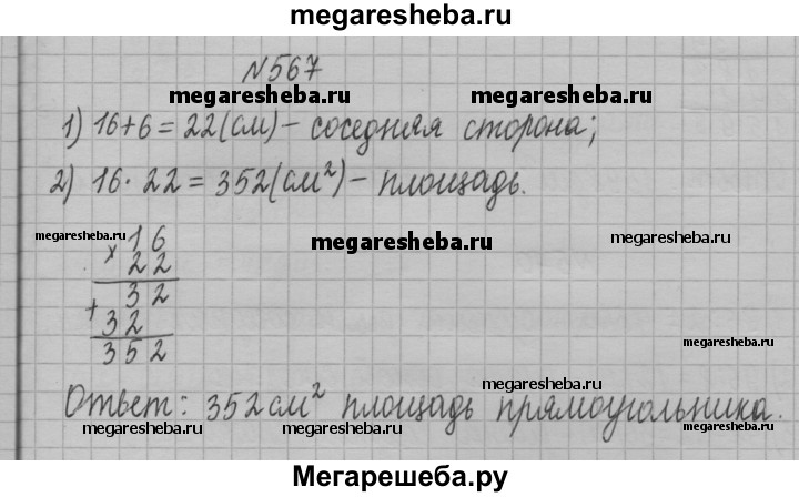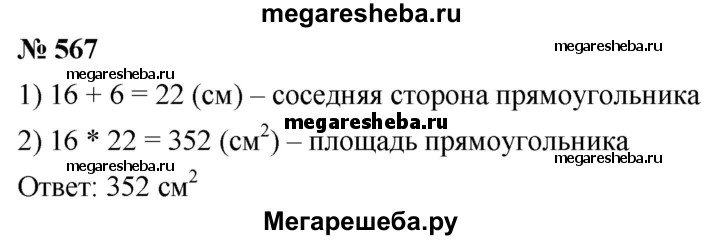567. Одна сторона прямоугольника равна 16 см, а соседняя сторона — на 6 см длиннее. Вычислите площадь прямоугольника.