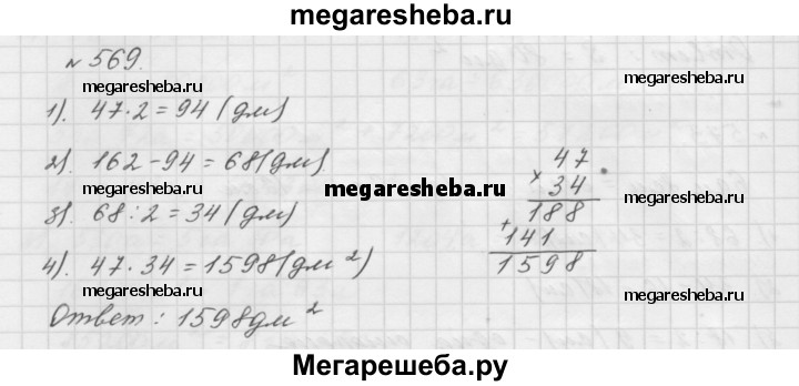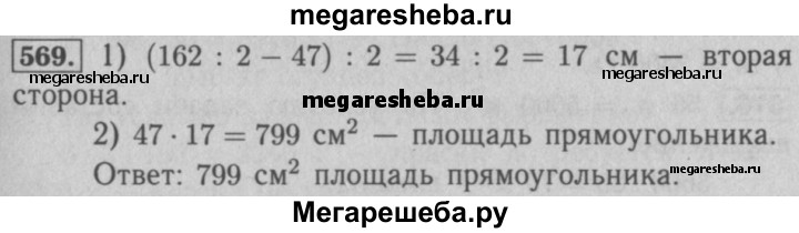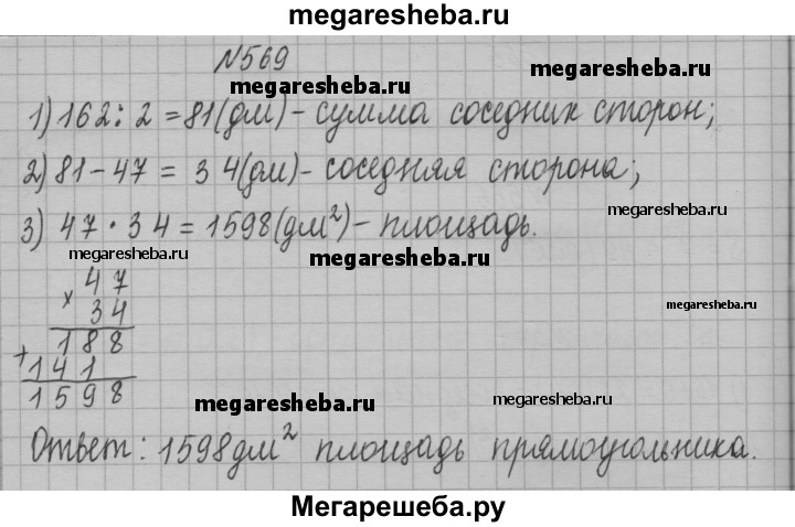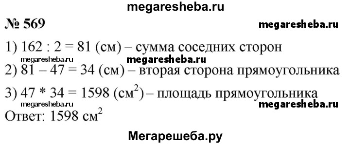 569. Периметр прямоугольника равен 162 дм, а одна из сторон — 47дм. Найдите площадь прямоугольника.