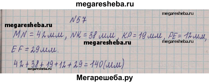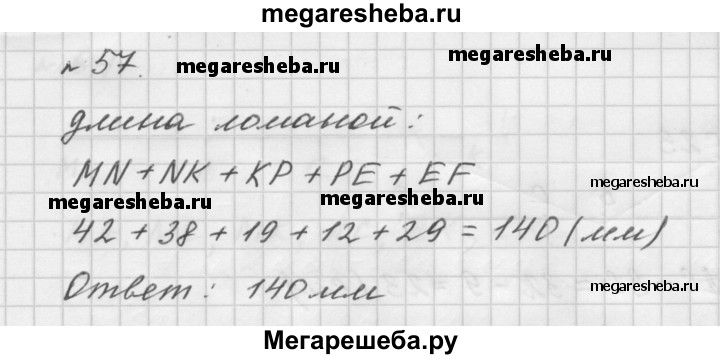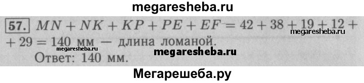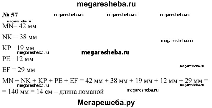 57. Вычислите длину ломаной MNKPEF, если MN= 42 мм, NK = 38 мм, КР= 19 мм, РЕ= 12 мм, ЕF= 29 мм.