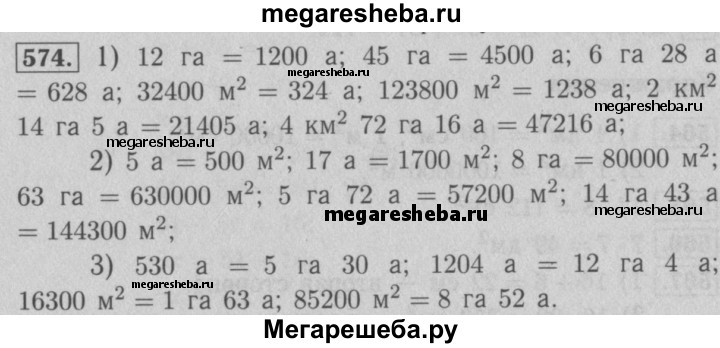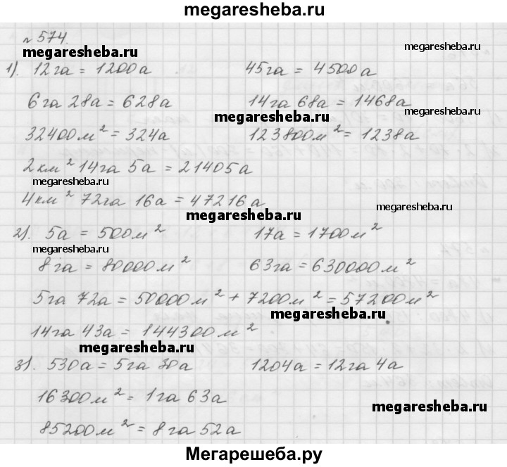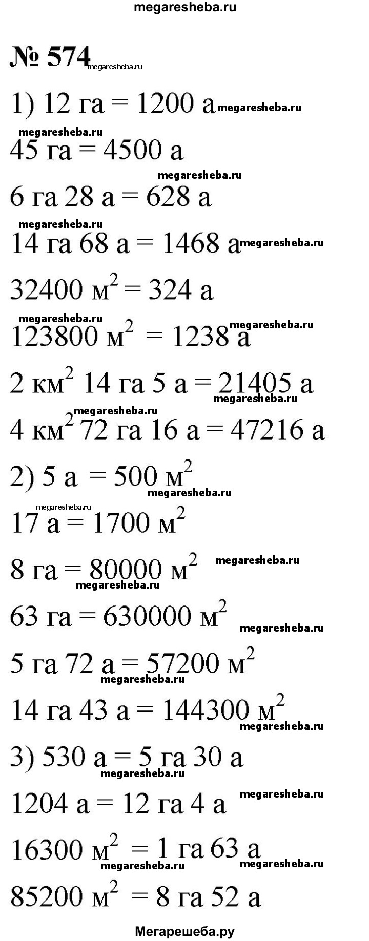 574. Выразите: 1) в арах: 12 га; 45 га; 6 га 28 а; 14 га 68 а; 32 400 м^2; 123 800 м^2; 2км^2 14 га 5 а; 4 км^2 72 га 16 а; 2) в квадратных метрах: 5 а; 17 а; 8 га; 63 га; 5 га 72 а; 14 га 43 а; 3) в гектарах и арах: 530 а; 1 204 а; 16 300 м^2; 85 200 м^2.