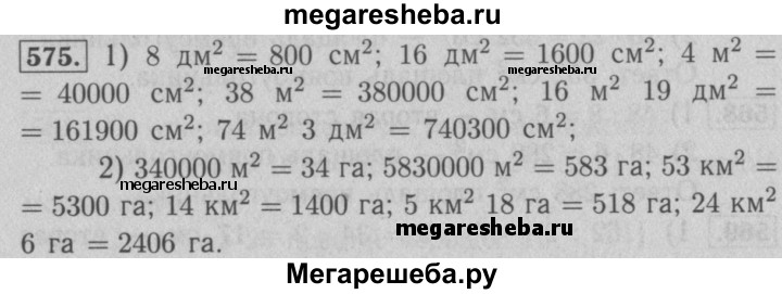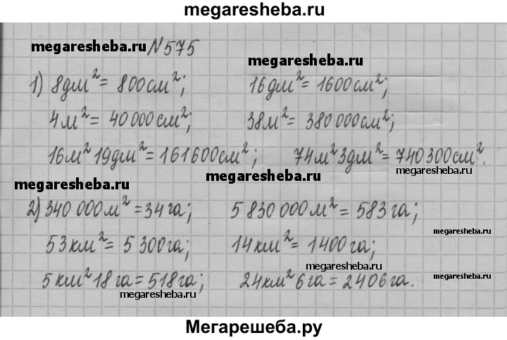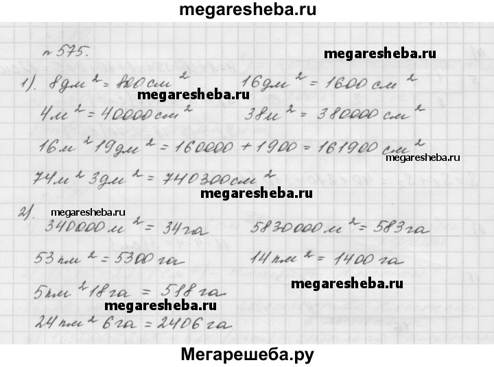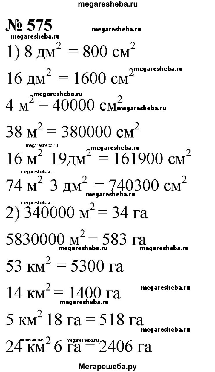 575. Выразите: 1) в квадратных сантиметрах: 8 дм^2; 16 дм^2; 4 м^2; 38 м^2; 16 м^2 19 дм^2; 74 м^2 3 дм^2; 2) в гектарах: 340 000 м^2; 5 830 000 м^2; 53 км^2; 14 км^2; 5 км^2 18 га; 24 км^2 6 га.