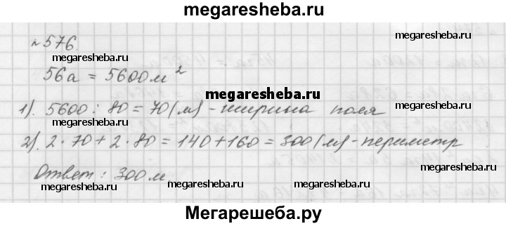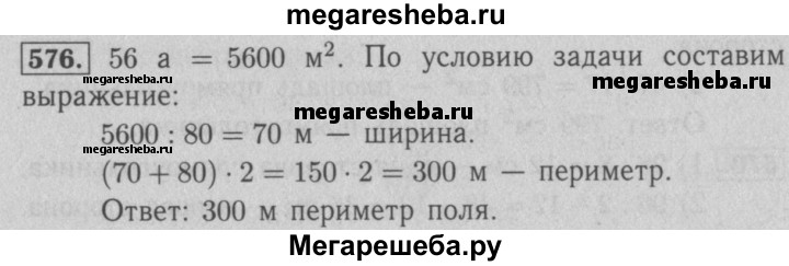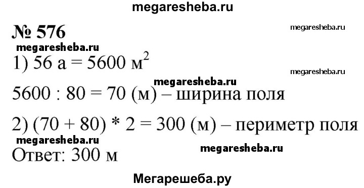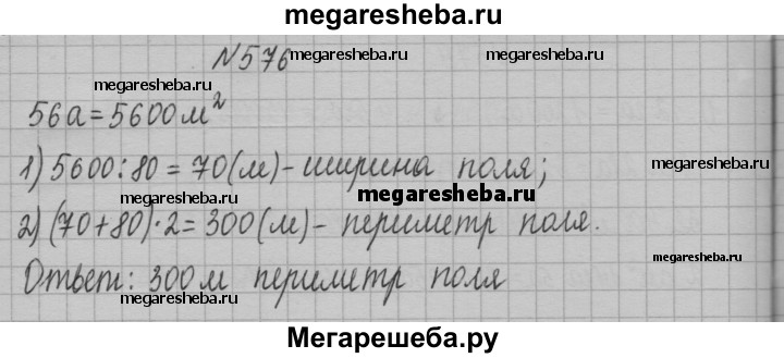 576. Поле прямоугольной формы имеет площадь 56 а, его длина — 80 м. Вычислите периметр поля.