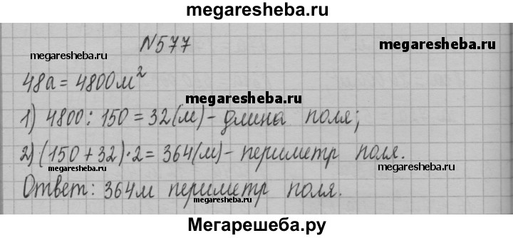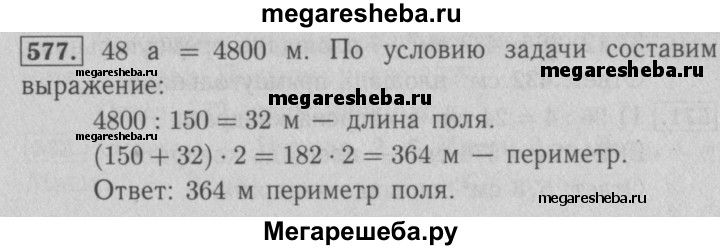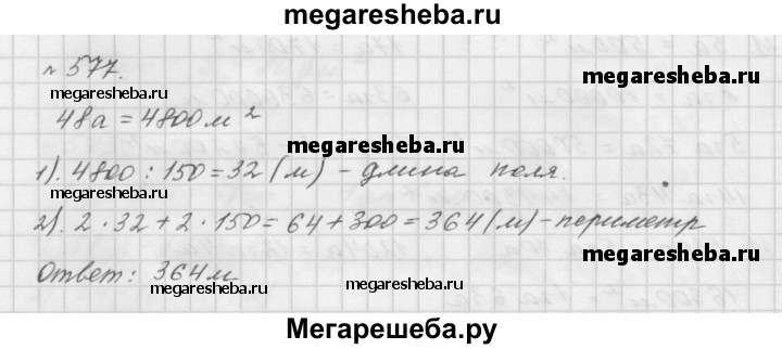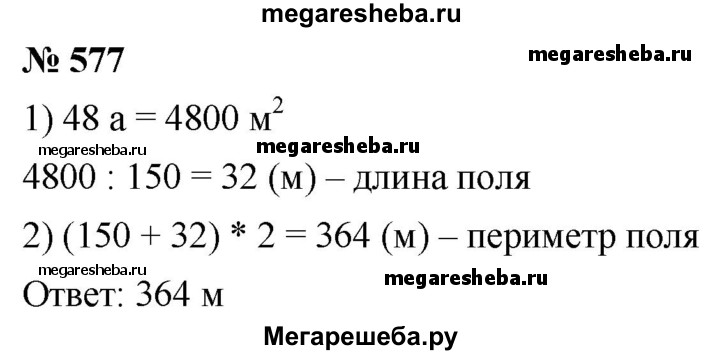 577. Поле прямоугольной формы имеет площадь 48 а, его ширина — 150 м. Вычислите периметр поля.