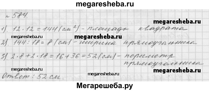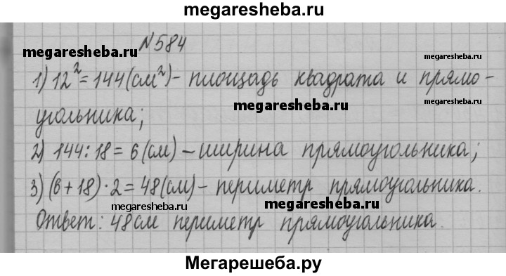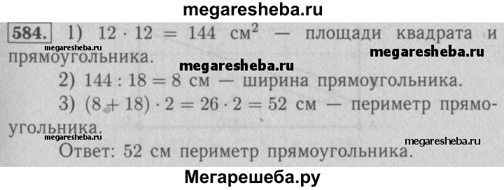 584. Квадрат со стороной 12 см и прямоугольник, длина которого равна 18 см, имеют равные площади. Найдите периметр прямоугольника.