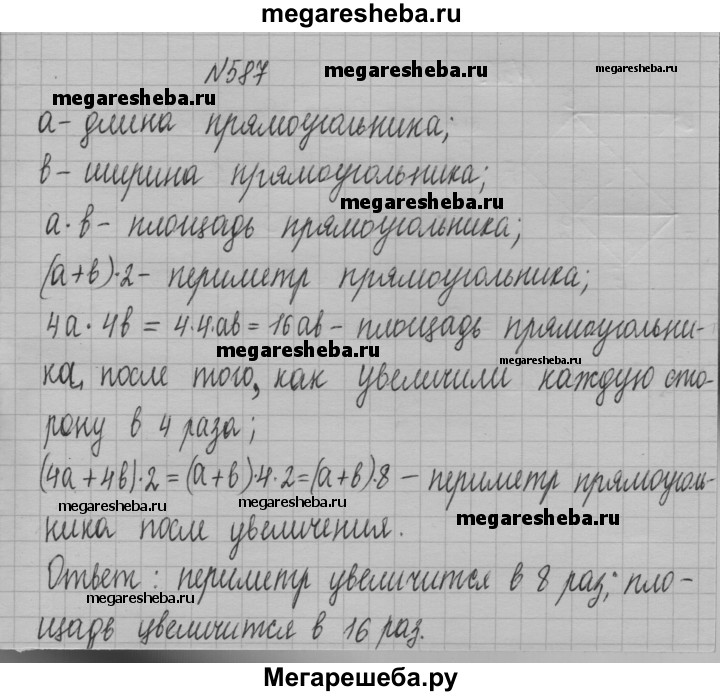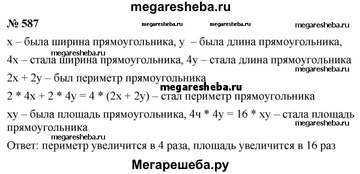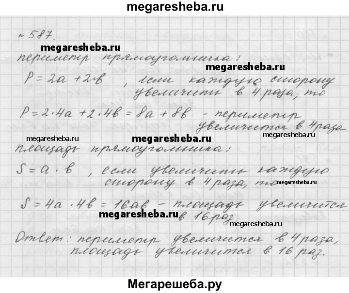 587. Во сколько раз увеличатся периметр и площадь прямоугольника, если каждую его сторону увеличить в 4 раза?