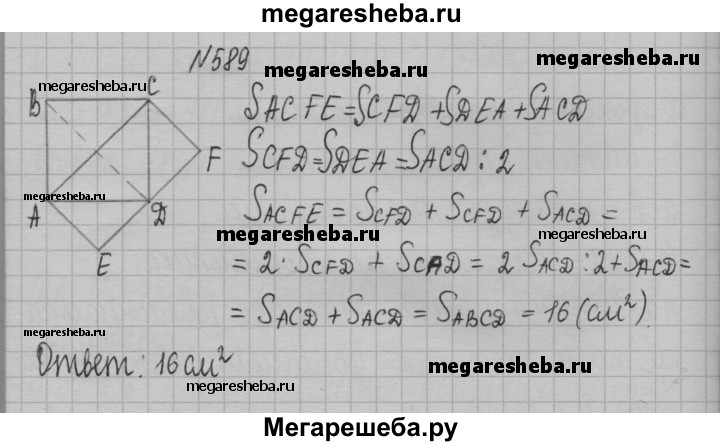 589. Площадь квадрата ABCD равна 16 см^2 (рис. 150). Чему равна площадь прямоугольника ACFE?