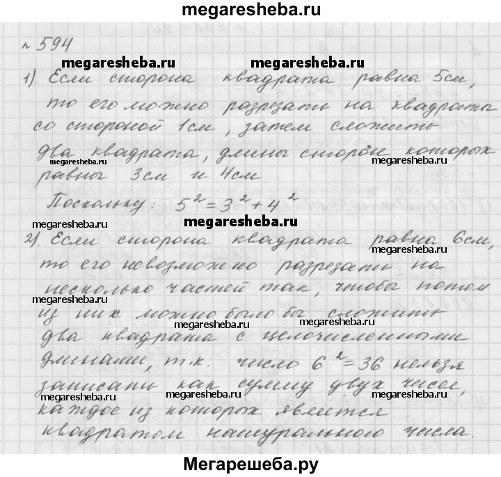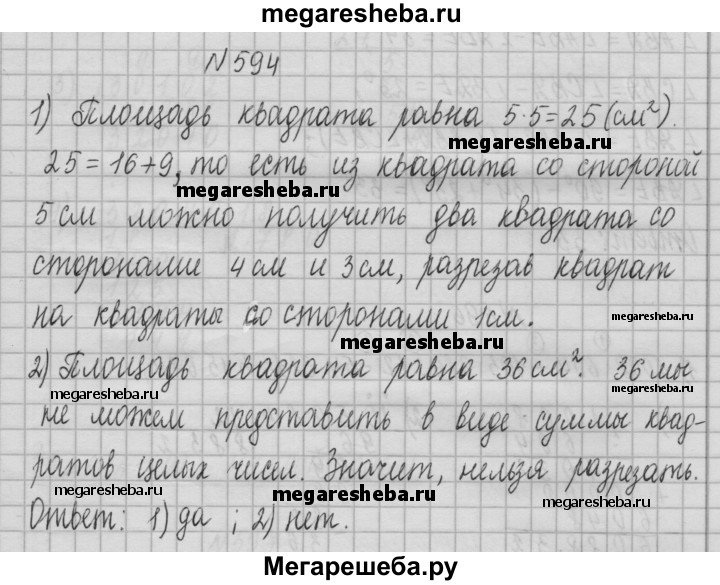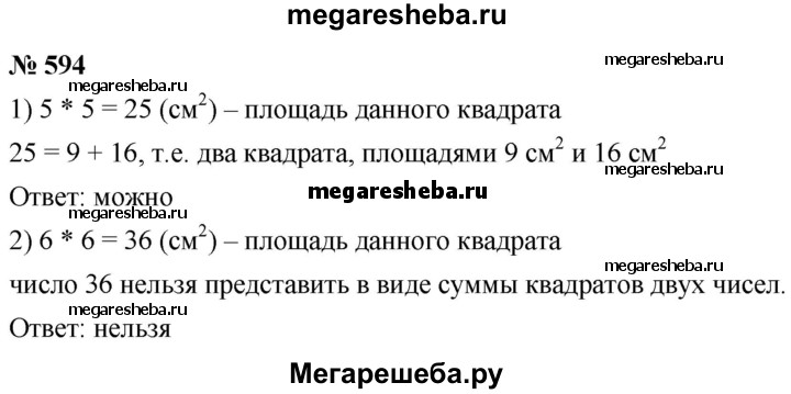 594. Можно ли разрезать квадрат на несколько частей так, чтобы потом из них можно было составить два квадрата, длины сторон которых выражаются целым числом сантиметров, если сторона данного квадрата равна: 1) 5 см; 2) 6 см?