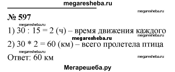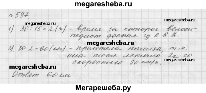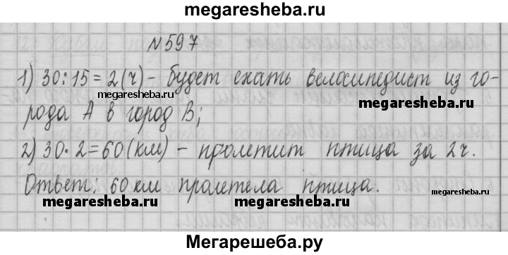597. Расстояние между городами А и В равно 30 км. Из города А в город В выехал велосипедист и двигался со скоростью 15 км/ч. Одновременно из города В в направлении города А вылетела птица со скоростью 30 км/ч. Встретившись с велосипедистом, птица развернулась и полетела назад. Прилетев в город В., она снова развернулась и полетела навстречу велосипедисту. Встретившись с ним, птица развернулась и полетела назад в город В и т. д. Сколько километров пролетела птица за то время, пока велосипедист ехал из города А в город В?
