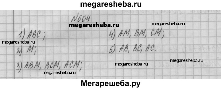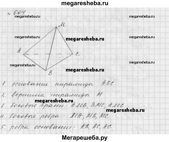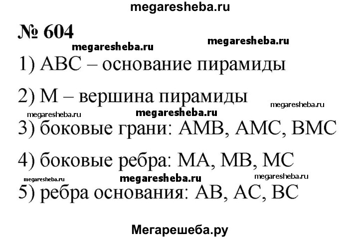 604. На рисунке 171 изображена пирамида МАВС. Укажите: 1) основание пирамиды; 2) вершину пирамиды; 3) боковые грани пирамиды; 4) боковые рёбра пирамиды; 5) рёбра основания пирамиды.