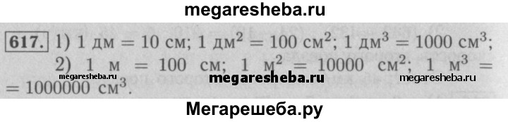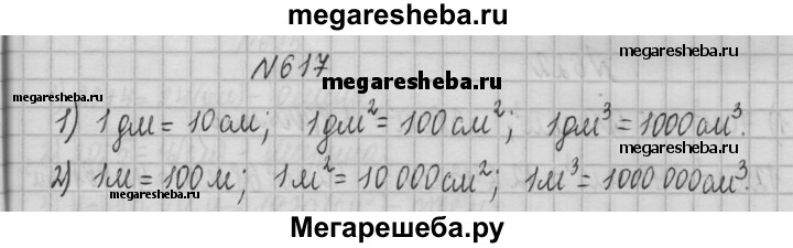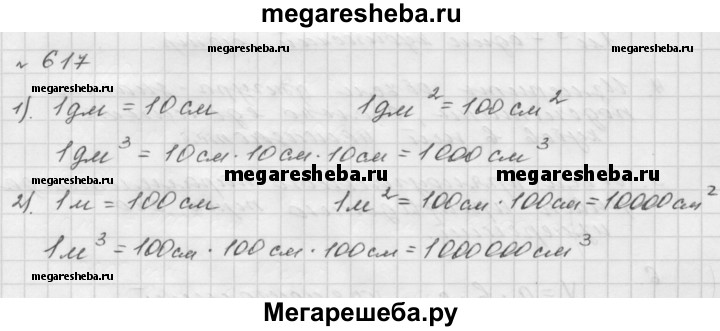 617. 1) Сколько сантиметров в одном дециметре? Квадратных сантиметров в одном квадратном дециметре? Кубических сантиметров в одном кубическом дециметре?? 2) Сколько сантиметров в одном метре? Квадратных сантиметров в одном квадратном метре? Кубических сантиметров в одном кубическом метре?