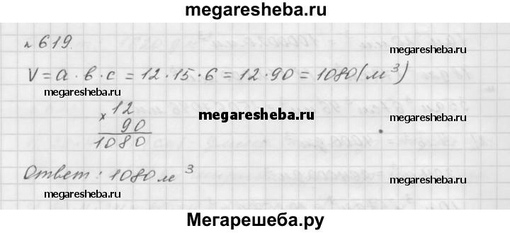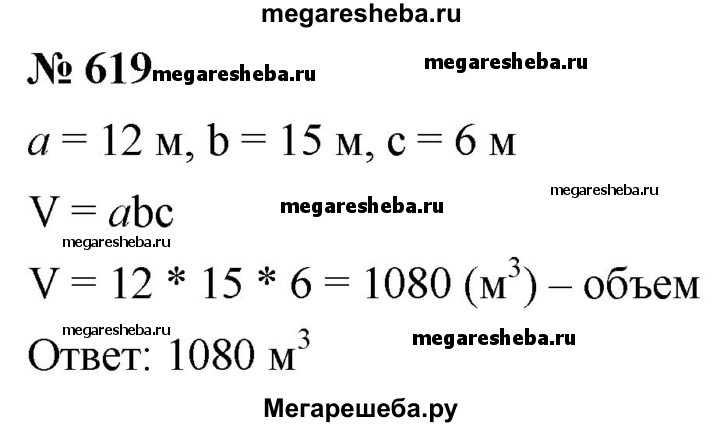 619. Вычислите объём прямоугольного параллелепипеда, измерение которого равна 12 м, 15 м и 6 м.