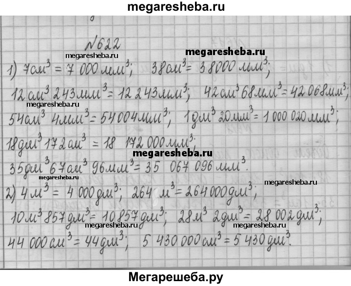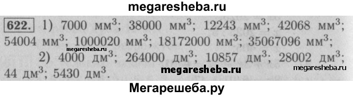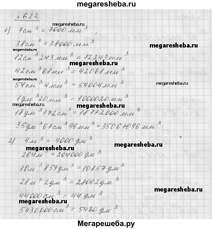 622. Выразите: 1) в кубических миллиметрах: 7 см^3; 38 см^3; 12 см^3 243 мм^3; 42 см^3 68 мм^3; 54 см^3 4 мм^3; 1 дм^3 20 мм^3; 18 дм^3 172 см^3; 35 дм^3 67 см^3 96 мм^3; 2) в кубических дециметрах: 4 м^3; 264 м^3; 10 м^3 857дм^3; 28 м^3 2 дм^3; 44000 см^3 ; 5 430 000 см^3.