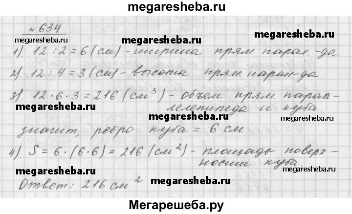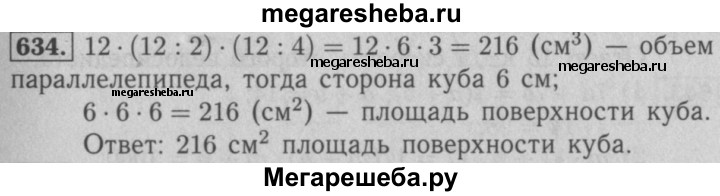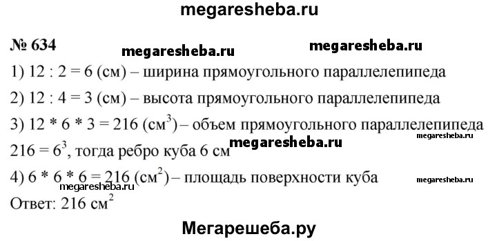634. Куб и прямоугольный параллелепипед имеют равные объёмы. Найдите площадь поверхности куба, если длина прямоугольного параллелепипеда равна 12 см, что в 2 раза больше ширины и в 4 раза больше высоты параллелепипеда.