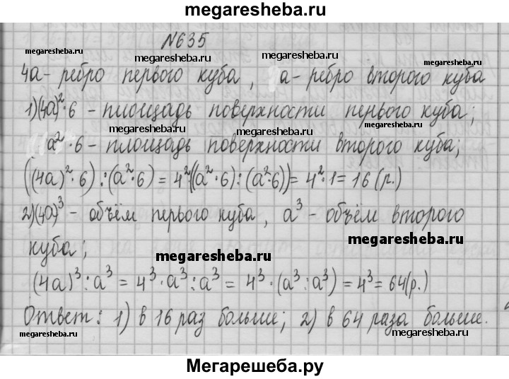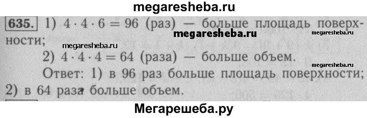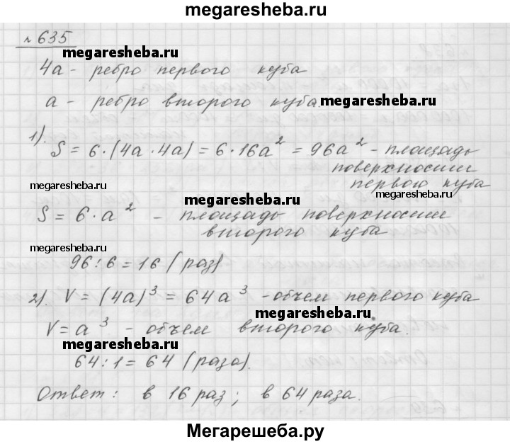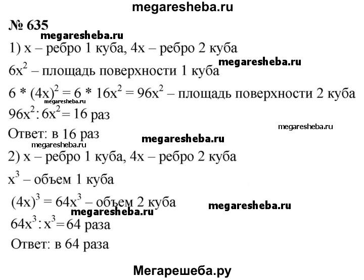 635. Ребро одного куба в 4 раза больше ребра второго. Во сколько раз: 1) площадь поверхности первого куба больше площади поверхности второго; 2) объём первого куба больше объёма второго? Как изменится объём прямоугольного параллелепипеда, если:
