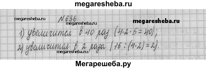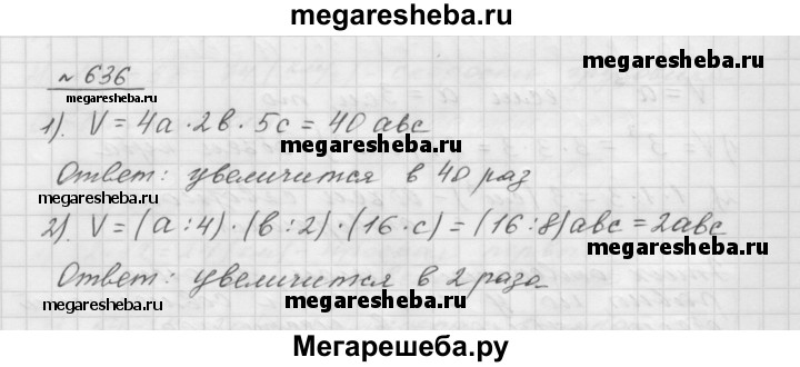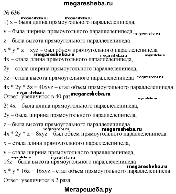 636. Как изменится объём прямоугольного параллелепипеда, если: 1) длину увеличить в 4 раза, ширину — в 2 раза, высоту — в 5 раз; 2) ширину уменьшить в 4 раза, высоту — в 2 раза, а длину увеличить в 16 раз?