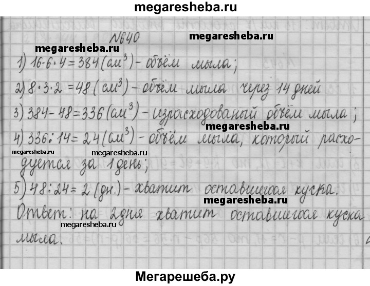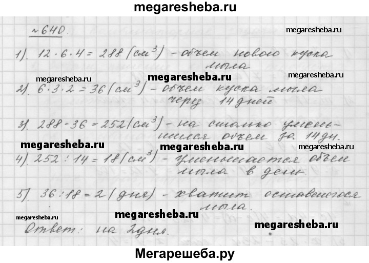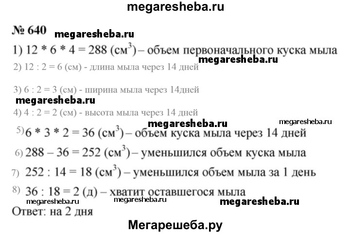 640. Размеры куска мыла, имеющего форму прямоугольного параллелепипеда, равны 12 см, 6 см и 4 см. Каждый день используют одинаковую массу мыла. Через 14 дней все размеры куска мыла уменьшились в 2 раза. На сколько дней хватит оставшегося куска мыла?