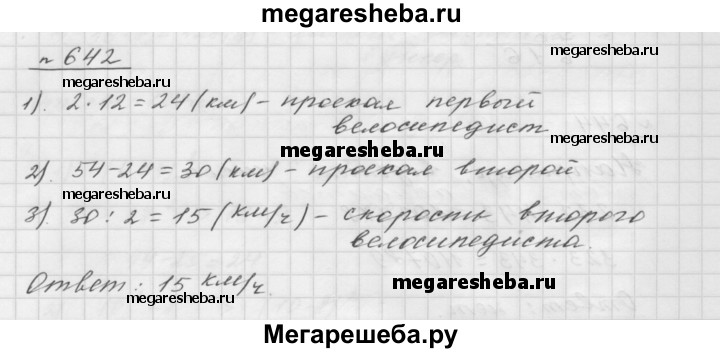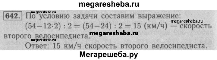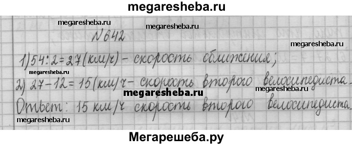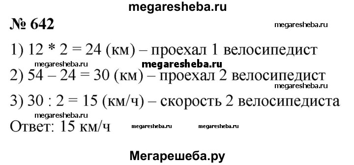 642. Из двух населённых пунктов, расстояние между которыми равно 54 км, одновременно выехали навстречу друг другу два велосипедиста и встретились через 2 ч после начала движения. Скорость движения первого велосипедиста составляла 12 км/ч. С какой скоростью двигался второй велосипедист??