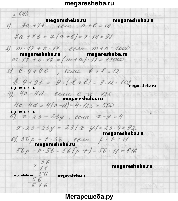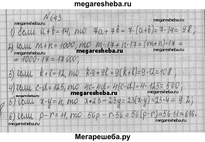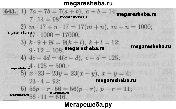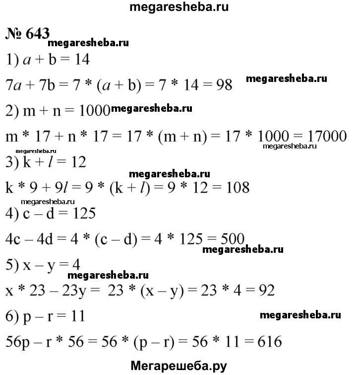 643. Найдите значение выражения: 1) 7а + 7b, если а +b = 14; 2) m • 17 + n • 17, если m + n= 1 000; 3) k • 9 + 9l, если k+l = 12; 4) 4с – 4d, если с - d = 125; 5) x • 23 – 23y, если x-y = 4; 6) 56p -r • 56, если р - r= 11.