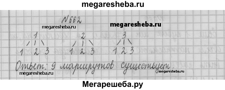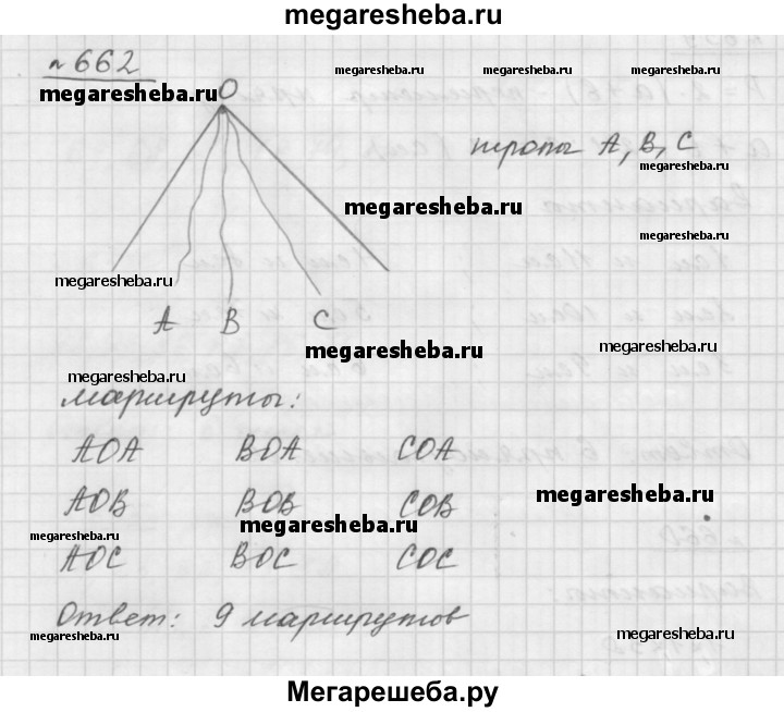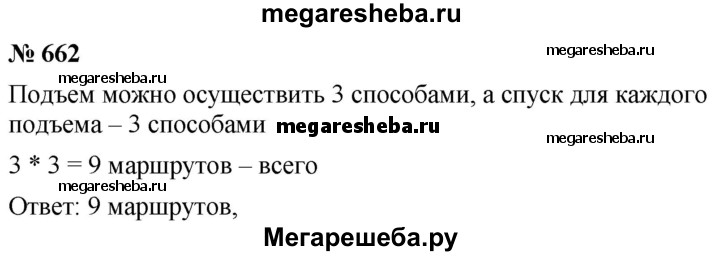 662. Подножие горы и её вершину связывают три тропы. Сколько существует маршрутов, ведущих от подножия к вершине и затем вниз к подножию?
