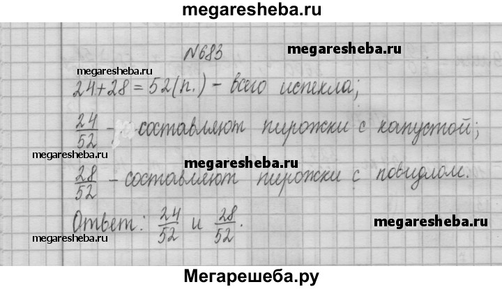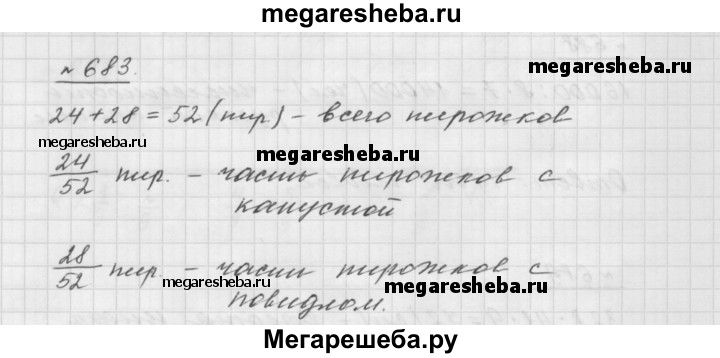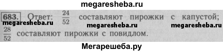 683. Маша испекла 24 пирожка с капустой и 28 пирожков с повидлом. Какую часть всех пирожков составляли пирожки с капустой и какую часть — пирожки с повидлом??