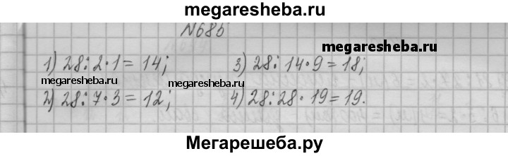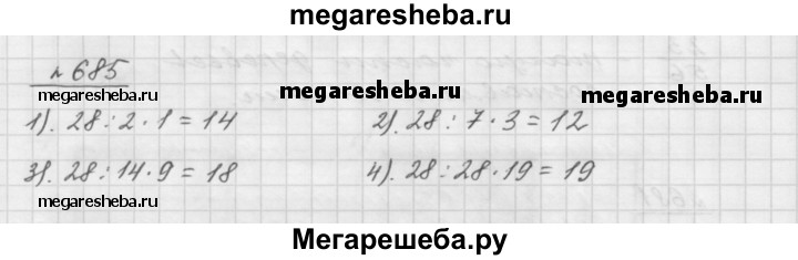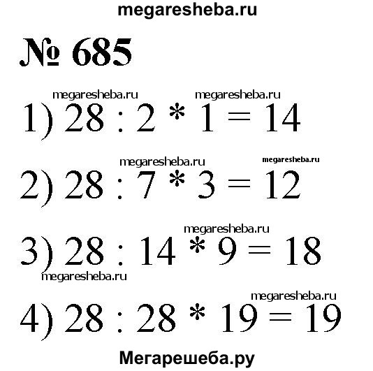 685. Найдите от числа 28: 1) 1/2; 2) 3/7; 3) 9/14; 4)19/28;