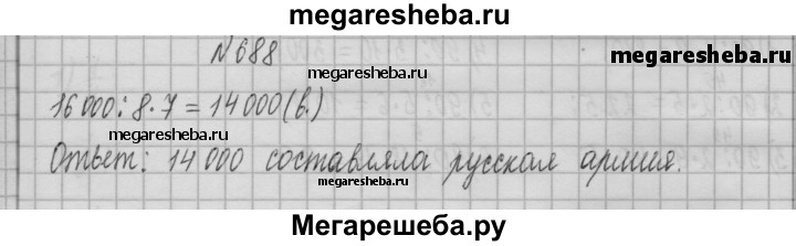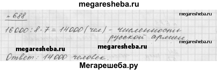 688. Во время Северной войны (1700-1721 гг.) между Россией и Швецией у деревни Лесная 28 сентября 1708 г. русская армия разбила шестнадцатитысячное шведское войско. Численность русской армии составляла 7/8 численности шведской. Какова была численность русской армии, сражавшейся у деревни Лесная?