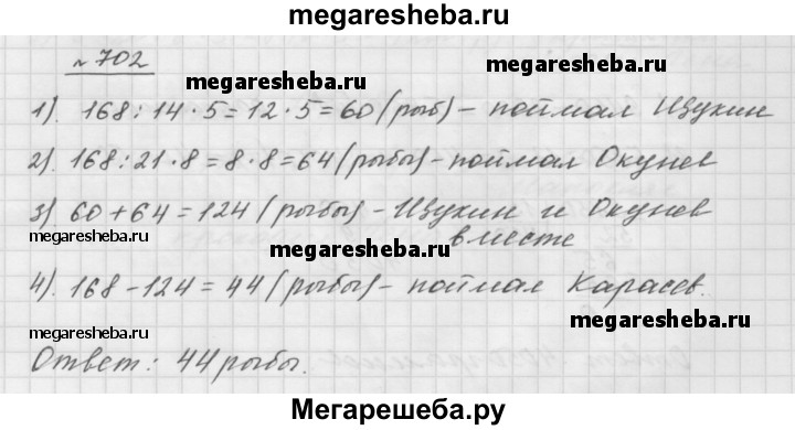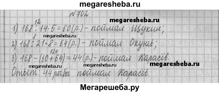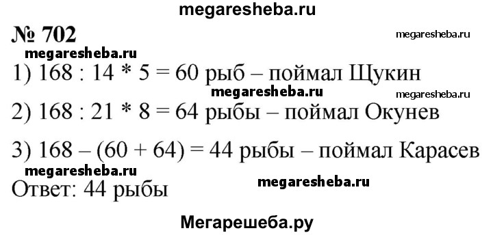 702. Три рыбака поймали 168 рыб. Щукин поймал 5/14 всех рыб, Окунев — 8/21 всех рыб, а Карасёв — остальные. Сколько рыб поймал Карасёв?