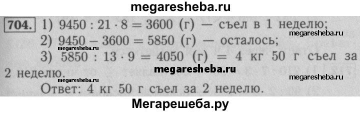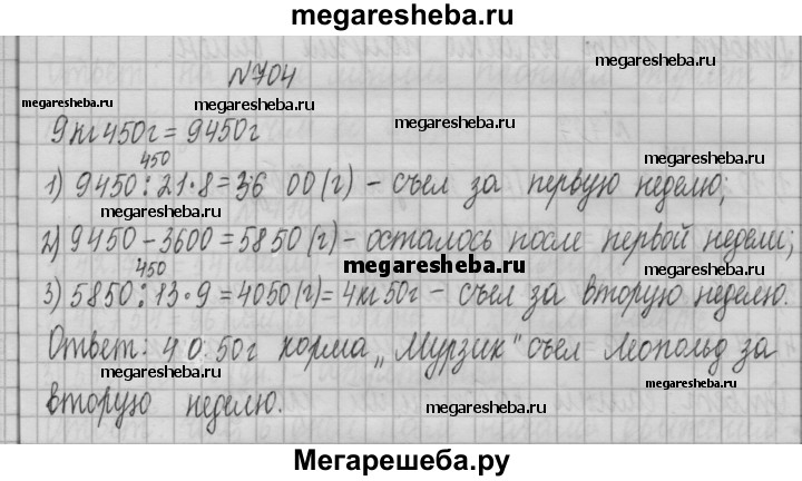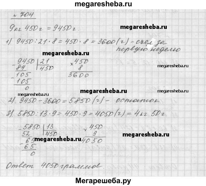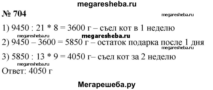 704. Мыши в знак примирения подарили коту Леопольду 9 кг 450 г корма «Мурзик». За первую неделю Леопольд съел 8/21подарка, а за вторую неделю — 9/13 остатка. Сколько граммов корма «Мурзик» съел Леопольд за вторую неделю?