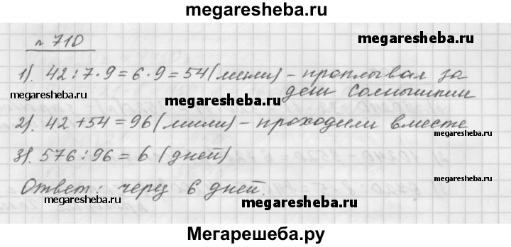 710. Из двух портов, расстояние между которыми равно 576 миль, одновременно навстречу друг другу вышли яхта капитана Врунгеля и корабль юнги Солнышкина. Яхта капитана Врунгеля проходила за день 42 мили, что составляет 7/9 того, что проплывал за день корабль Солнышкина. Через сколько дней после начала движения встретятся мореплаватели?