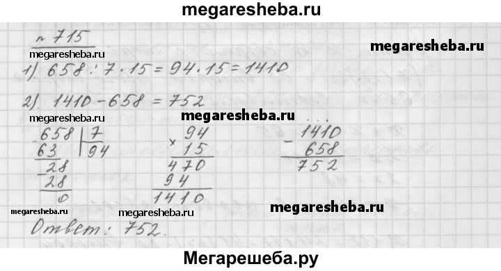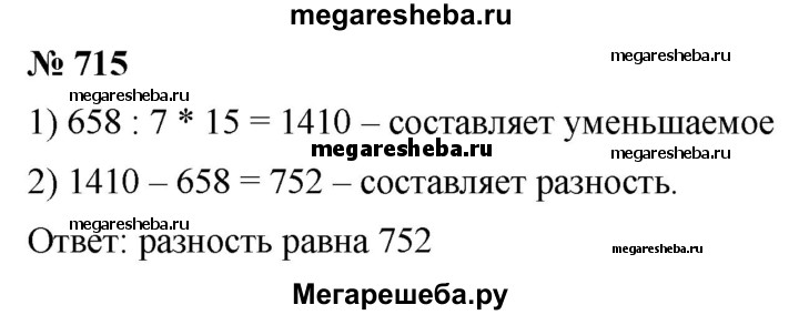 715. Найдите разность двух чисел, если вычитаемое равно 658 и оно составляет 7/15 уменьшаемого.