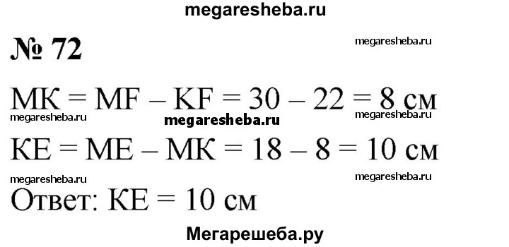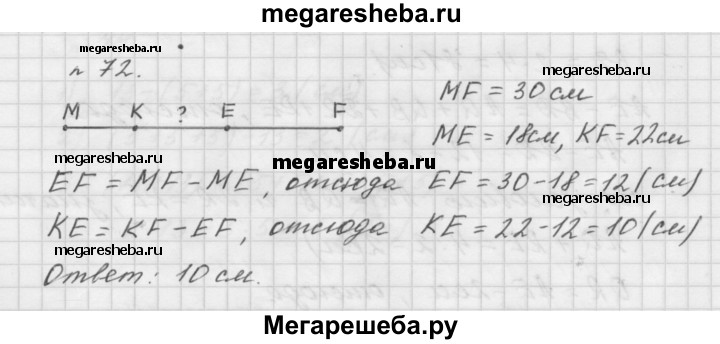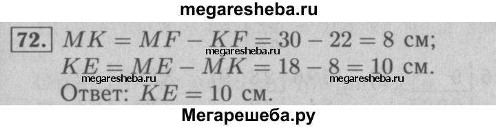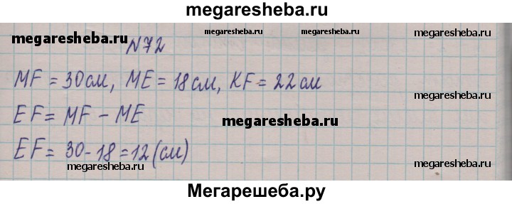 72. Известно, что МF = 30 см, МЕ= 18 см, КF = 22 см (рис. 28). Найдите длину отрезка КЕ.