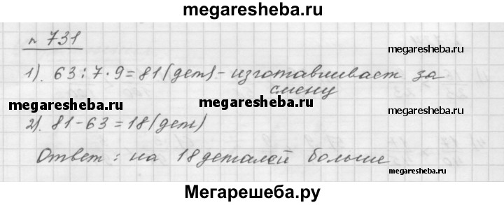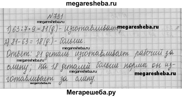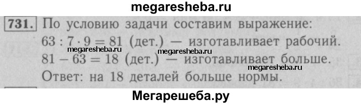 731. За смену рабочий должен изготовить по норме 63 детали. Но он выполняет 9/7 нормы. Сколько деталей изготавливает рабочий за смену? На сколько деталей больше нормы он изготавливает за смену?