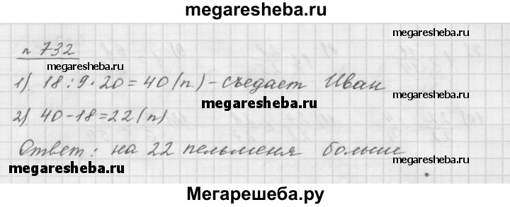 732. Порция пельменей в кафе «Пампушечка» состоит из 18 пельменей. Иван Гурманов съедает за обедом 20/9 порции. Сколько пельменей съедает за обедом Иван? На сколько пельменей больше одной порции он съедает?