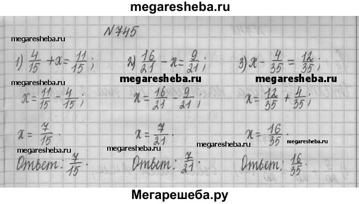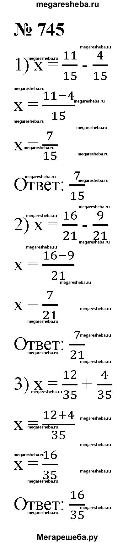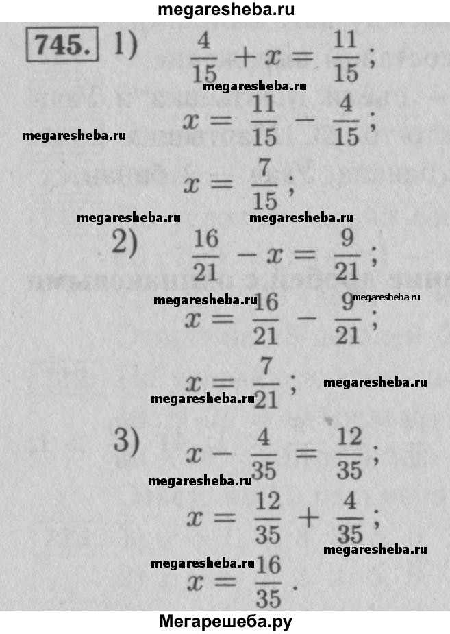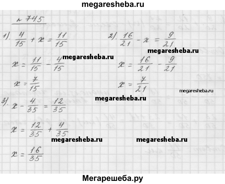 745. Решите уравнение: 1) 4/15+x=11/15; 2) 16/21-x=9/21; 3) x-4/35=12/35.